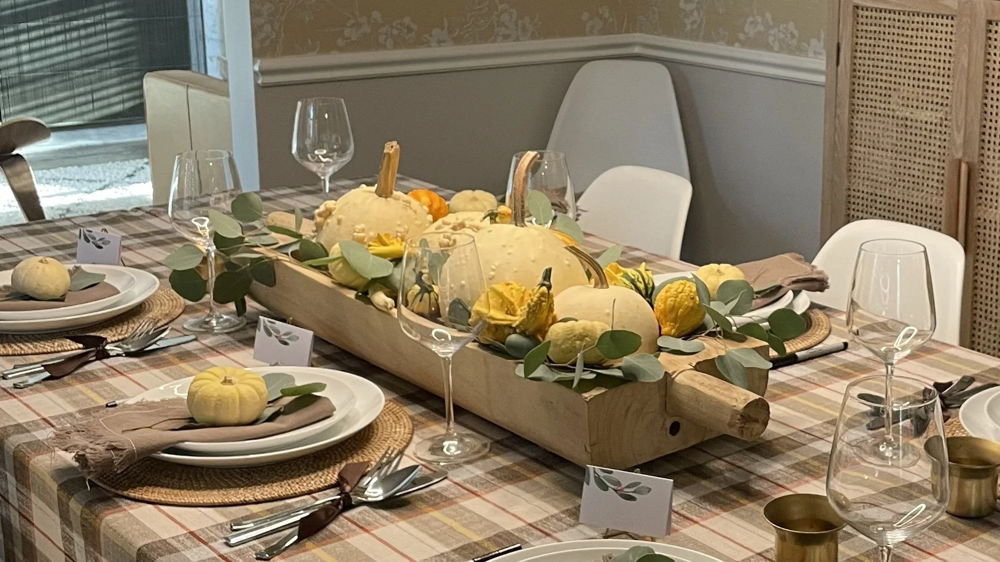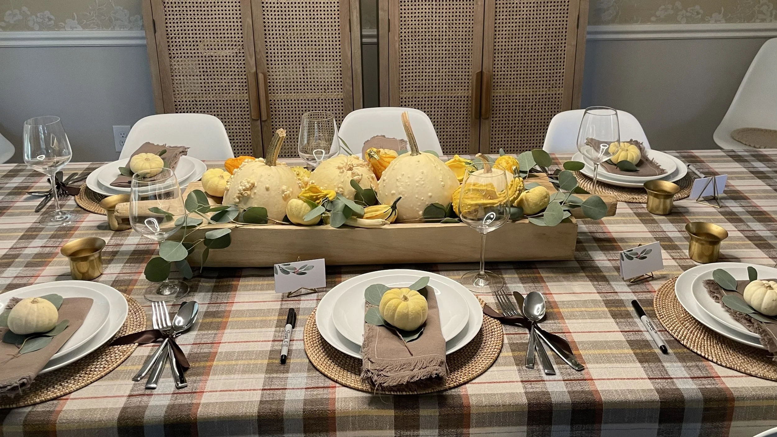 Local white pumpkins set the tone for this holiday table. Jessica mixed in the client’s wholesome tableware and serving pieces, giving Thanksgiving a fresh spin on a dime. She added note cards so everyone at the table could share anonymously what they were most grateful for. The whole setup felt effortless and inviting—exactly what the hostess ordered.